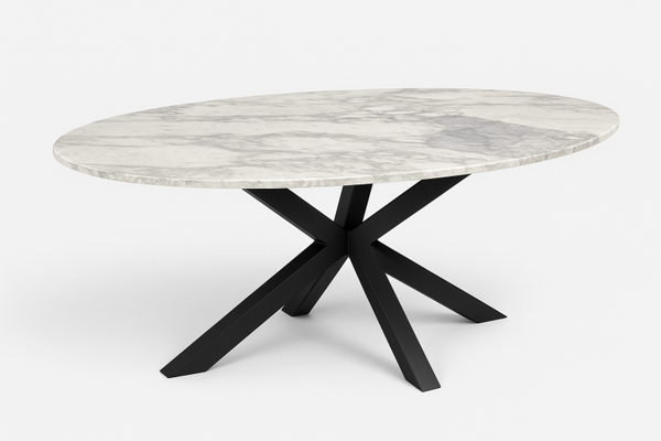 Een prachtige ovale maatwerk eettafel, vervaardigd uit hoogwaardig Italiaans Arabescato marmer met zwarte metalen matrix tafelpoot. Deze ovale tafel heeft de afmetingen 200x90cm, waar je makkelijk met 6 personen omheen kan zitten.